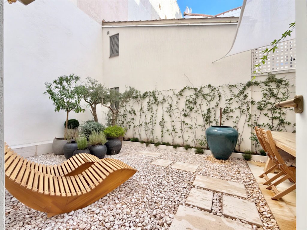 - El oasis privado de 28 m². Accesible directamente desde el dormitorio, el patio privado de 28m2, con su cuidado paisajismo al estilo Japandi, es un oasis de tranquilidad y elegancia en plena ciudad, un tesoro en el centro de Madrid. Es el lugar ideal para desayunar en una mesa amplia, al aire libre o bajo el toldo, relajarse en las tumbonas con el sonido de la fuente de agua, o disfrutar por la noche de su iluminación ambiental y acogedora.