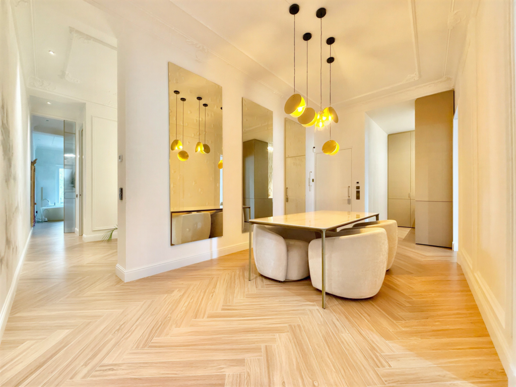 La entrada da a un amplio y sofisticado comedor, donde se pueden apreciar los techos altos, los amplios espacios y la armonía de la decoración. También se distingue el papel pintado realizado a mano por un artista, que continúa a lo largo de todo el pasillo. En el pasillo se encuentra un baño completo adicional con revestimiento porcelánico de efecto mármol que cuenta con un lavabo, una ducha y un aseo.