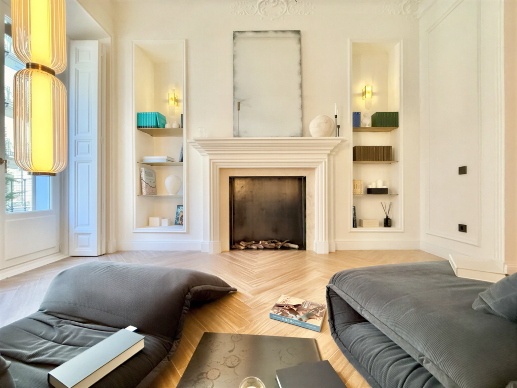 - El salón de recepción con piano y chimenea. Este espacio contemporáneo y luminoso con techos de más de 3 metros cuenta con tres balcones y vistas 180º a la calle. La chimenea de bioetanol, el piano vertical Yamaha y las estanterías empotradas e iluminadas, le confieren una atmósfera lounge y elegante, además de los muebles y elementos decorativos de diseño cuidadosamente seleccionados.