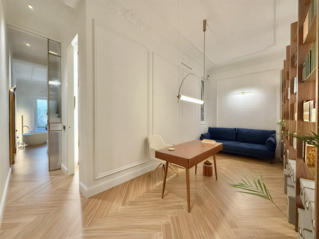 - El gran despacho-biblioteca. Actualmente integrado al pasillo, este amplio espacio cuenta con una impresionante librería de suelo a techo con estantes luminosos, un escritorio y un sofá cama elegante y cómodo. Es el entorno perfecto para el profesional que requiere un entorno de trabajo espacioso, inspirador y con carácter.