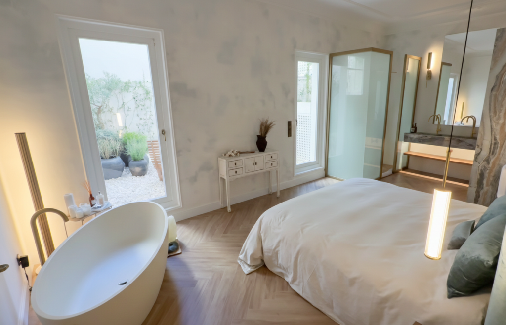 - La Master Suite “wellness” con dormitorio, bañera de diseño y cuarto de baño integrado. Un amplio vestidor de madera abierto, alto y profundo, conduce a la zona de descanso, convertida en un verdadero santuario de relajación. El centro de la experiencia es una bañera de diseño estratégicamente ubicada junto a un gran ventanal con vistas y acceso directo a un encantador patio privado. Una cama doble y un baño semiabierto con revestimiento porcelánico pintado a mano, imitando a la perfección la piedra natural, con dos duchas, dos lavabos y un aseo, completan este espacio de bienestar.